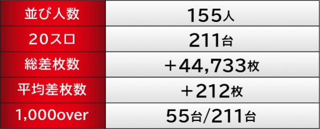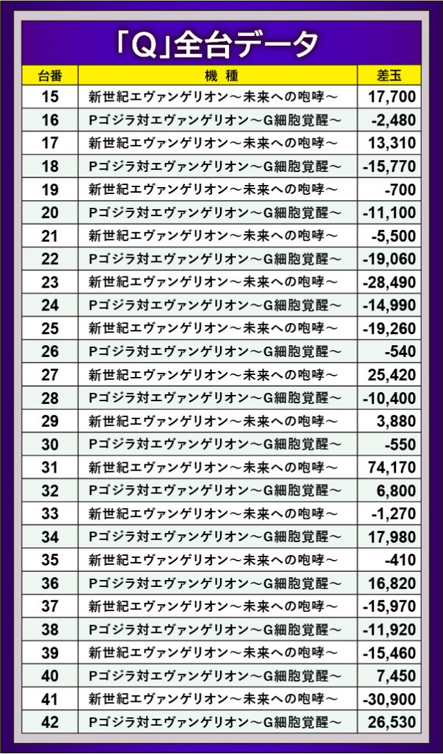 『新世紀エヴァンゲリオン〜未来への咆哮〜』31番台+74,170玉という凄まじい記録を確認でき、他にも27番台+25,420玉という数字も見られる。また『Pゴジラ対エヴァンゲリオン〜G細胞覚醒〜』でも42番台+26,530玉という熱気を放っており、島はかつてない盛り上がりに包まれていたと言えるだろう。