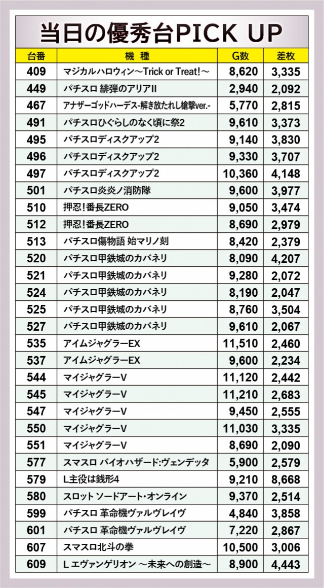 優秀台をチェックしてみると、『マジカルハロウィン〜Trick or Treat!〜』や『パチスロディスクアップ2』の名前が目に焼きつく。409番台+3,335枚や497番台+4,148枚と大きな熱気を放ち、さらには朝から閉店まで活気が絶えないなど、盛り上がりを披露していた。万回転OVER達成台も多く見られ、誰もが自信を持ってレバーを叩いていた様子だ。