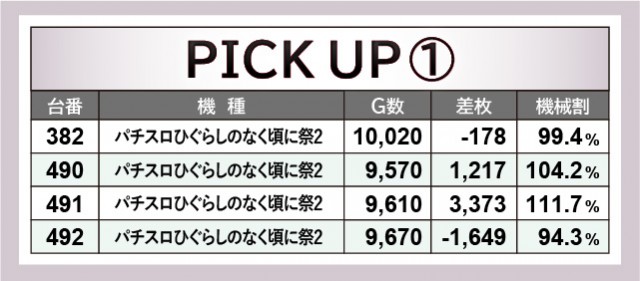 『パチスロひぐらしのなく頃に祭2』は当然のように9千回転台をマークし、382番台は万回転OVER達成している。その中で491番台+3,373枚と右肩上がりのグラフを描き、充実度の高い1日を過ごしていた様子が窺える。また『ファンキージャグラー2』も同様で、こちらでもコンスタントなボーナス当選により、ファンが笑顔を覗かせていたのが印象的だ。
