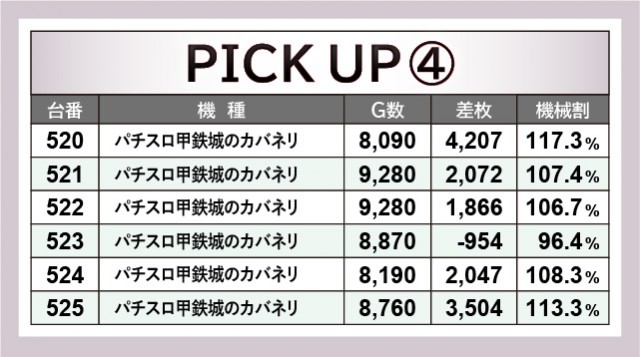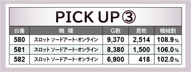 AT機群からは『スロット ソードアート・オンライン』『パチスロ甲鉄城のカバネリ』をピックアップ。前者は全台プラス差枚を達成しており、後者についても520番台+4,207枚や525番台+3,504枚と大きな熱気を放っていた。こちらでも閉店まで打ち込まれた形跡を確認できることから、相当な手応えを感じていたのは間違いないだろう。