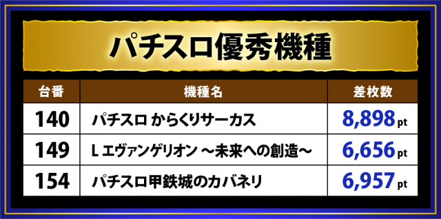 次いで『パチスロ甲鉄城のカバネリ』154番台では+7千弱、新台導入間もない『L エヴァンゲリオン ~未来への創造~』149番台では+6千7百弱と、紹介した3台全てがハイクオリティの結果を収めた。