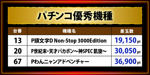 続いて『P世紀末・天才バカボン〜神SPEC 凱旋〜』20番台が+3万突破、『P頭文字D Non-Stop 3000Edition』13番台が+2万目前と、比較的導入から日が浅い3台がハイレベルの差玉を叩き出した。