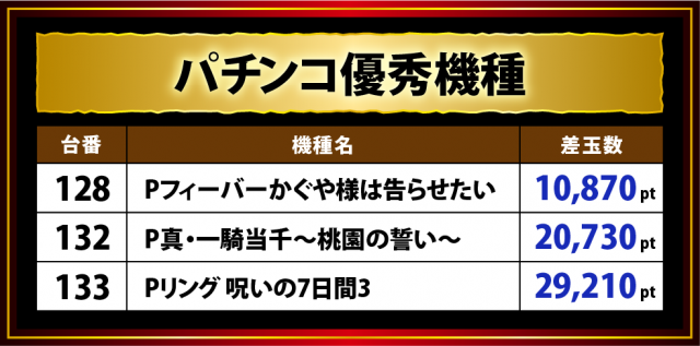 その他では『P真・一騎当千~桃園の誓い~』『Pフィーバーかぐや様は告らせたい』の2台が5桁のプラスを残した。今回の3台は比較的導入から日数の経っていない機種となり、実力を発揮した形だ。