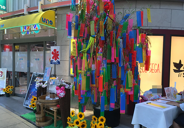店の入り口では浴衣姿のスタッフがお出迎え。隣には短冊を書けるコーナーや冷たい氷も設置されており、涼しげな印象を受けた。