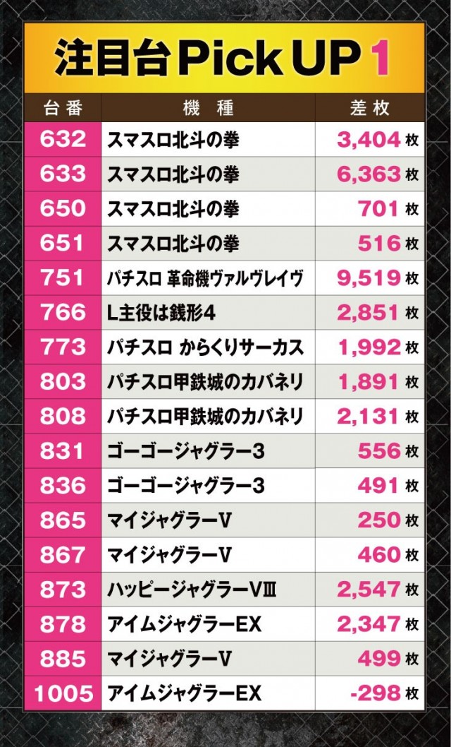 店内状況はというと、満遍なく至る所から好調台が誕生しており、1台を除き全台がプラスといった見事な結果を残している。