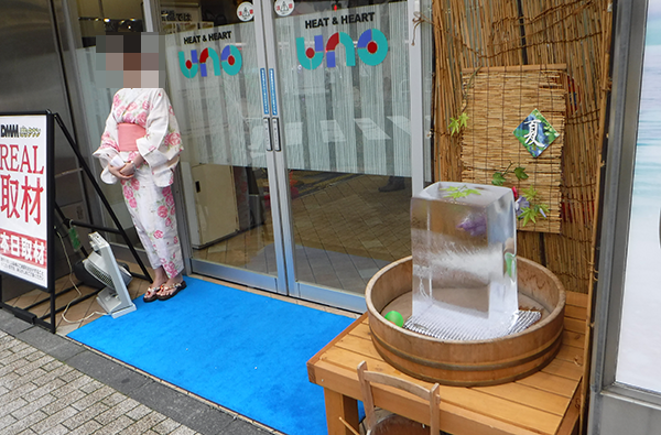 この日、入り口には浴衣姿のスタッフがおり、そばには氷も置かれていた。涼やかな演出からも、プレイヤーたちに楽しんでもらいたいといったホールの思いが伝わってくるようだ。