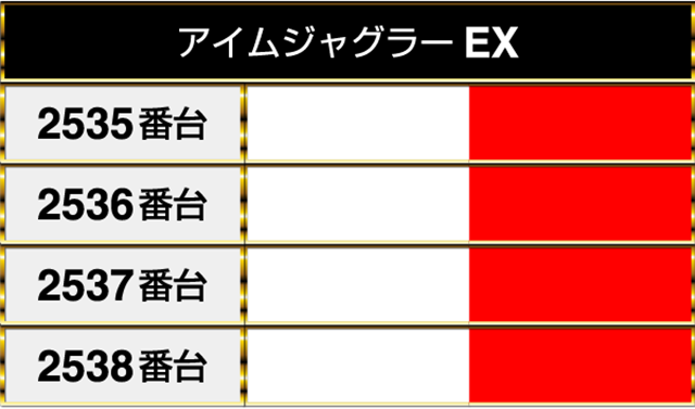 『アイムジャグラーEX』の2535番台から2538番台までが並んでプラスptを記録!