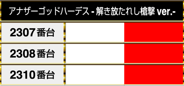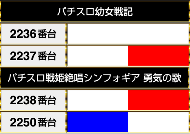 『パチスロ幼女戦記』の2236番台から『パチスロ戦姫絶唱シンフォギア 勇気の歌』の2250番台までにも華やかな光景が広がっていた。