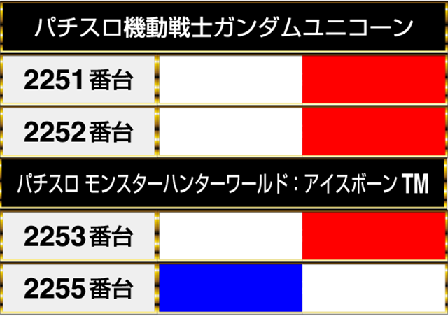 『パチスロ機動戦士ガンダムユニコーン』と『パチスロ モンスターハンターワールド:アイスボーンTM』もにぎわっており、プレイヤーたちは充実した時間を過ごせている様子。