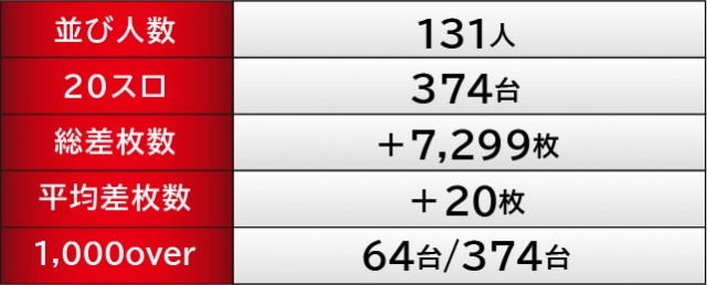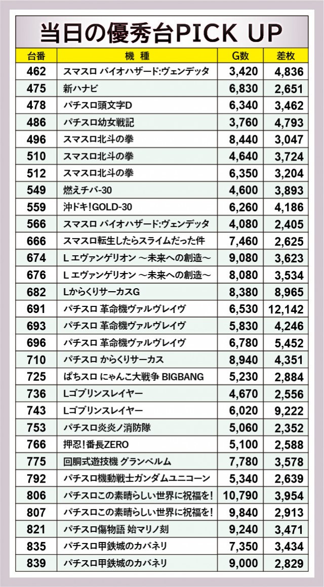 この日は『パチスロこの素晴らしい世界に祝福を!』全3台が大きな盛り上がりを披露し、優秀台にも806番台+3,954枚・807番台+2,913枚がランクインした。回転数を見ても充実度を如実に窺うことができるため、レバーを強く叩いていた光景が容易に想像できる。また『Lゴブリンスレイヤー』743番台+9,222枚という万枚未遂、『パチスロ からくりサーカス』682番台+8,965枚も追随する勢いを披露し、館内の熱気は十分に高かったと言えよう。