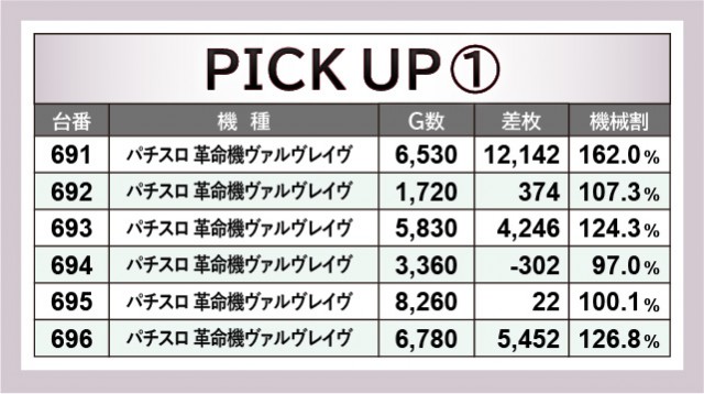 『パチスロ 革命機ヴァルヴレイヴ』からは凄まじい熱気が放たれ、上記のような結果が生まれている。691番台+12,142枚や693番台+4,246枚、696番台+5,452枚と、大台突破台が複数生まれているのは、同店の意気込みの表れと言えるだろう。895番台に関しても、朝から閉店まで打ち込まれていることから、やはりファンは手応えを感じていたのは間違いない。