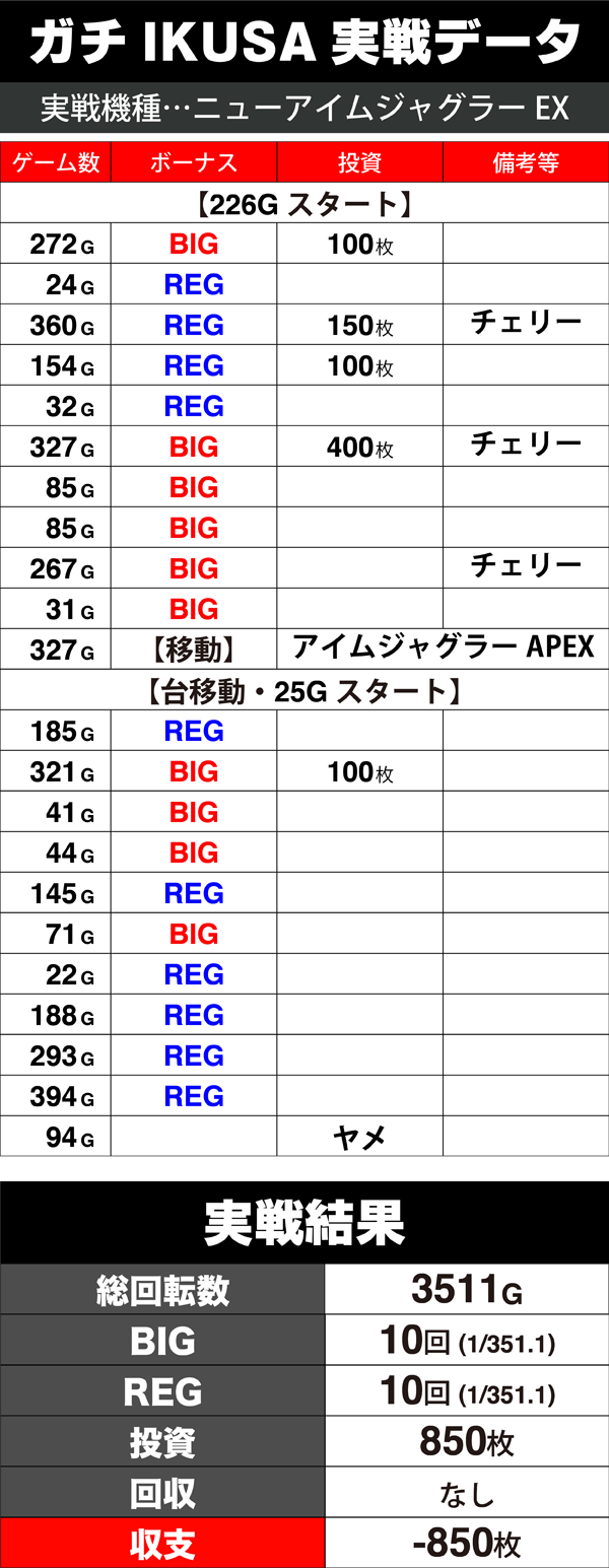 さらにボーナス合算確率のよい台が空いたため、持ち玉とともに台移動をしたものの、移動先でも似たような展開となり、総投資850枚で引いたREGのメダルがなくなったところで実戦終了。
