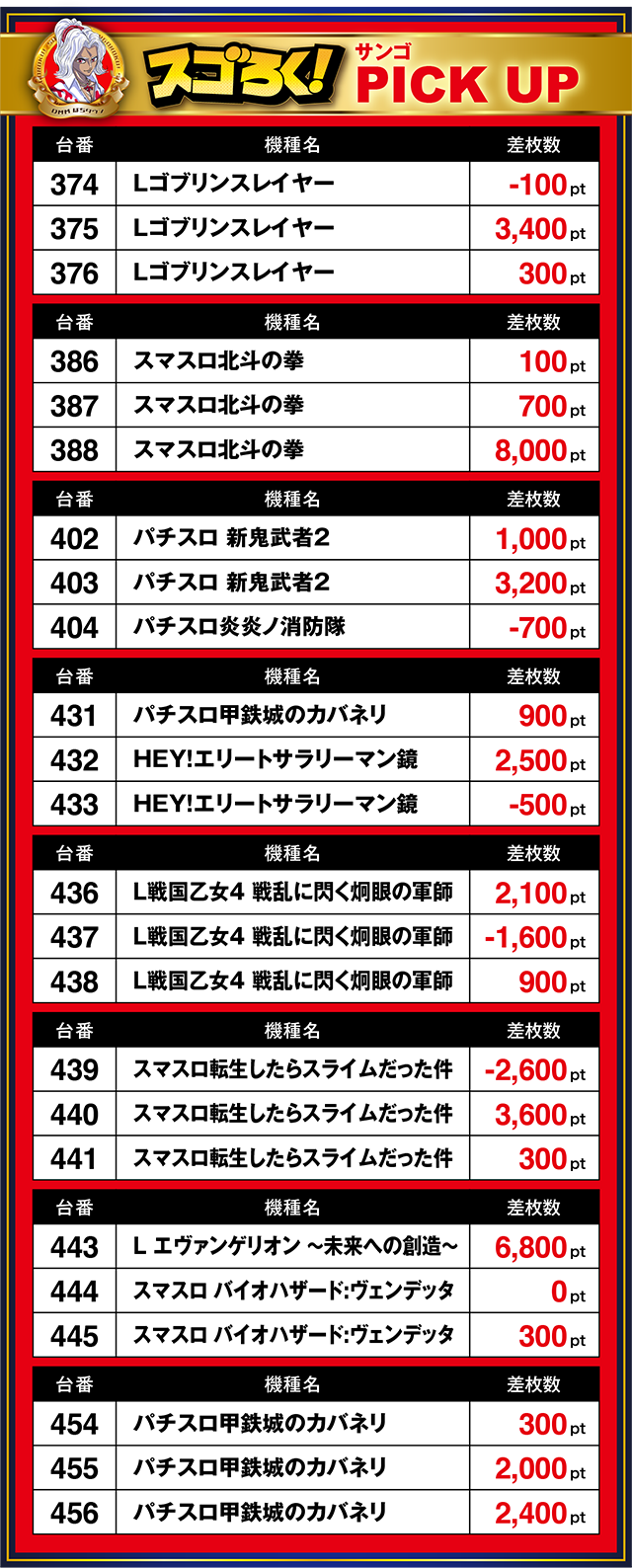386番台からはじまる3台がとくに素晴らしく、最終的には全台がプラスなうえに、388番台は8,000ptと好記録だ。