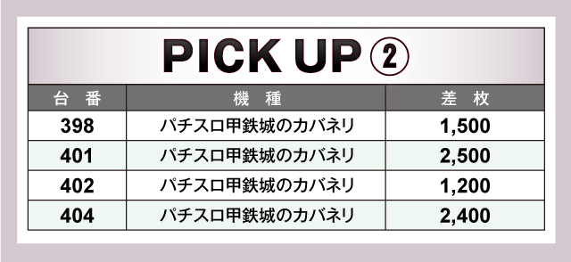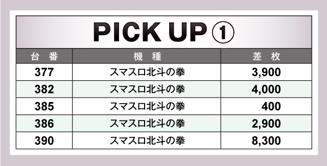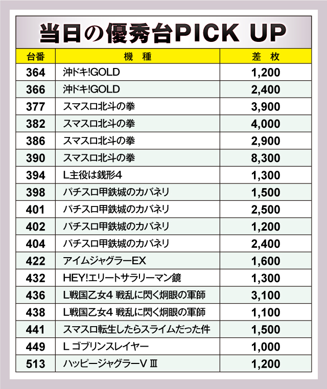 上表の優秀台をご覧の通り、この日は『スマスロ北斗の拳』が熱気と活気の中心になっていた。390番台+8,300枚という大きな数字を築いては、他にも377番台+3,900枚や382番台+4,000枚など、盛り上がりの様子が容易に想像できる。ほかにも人気機種『パチスロ甲鉄城のカバネリ』がコンスタントに結果を残しており、ファンは手応えを感じては、レバーを強く叩いていたことだろう。