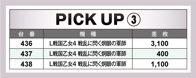 『スマスロ北斗の拳』『パチスロ甲鉄城のカバネリ』両機種の活躍ぶりは、前述した通りである。全国的に人気を集めるマシンがしっかりと結果を残した一方で、『L戦国乙女4 戦乱に閃く炯眼の軍師』が負けじと熱気を放っていた。436番台+3,100枚を筆頭にコンスタントな大当りを披露しては、全3台がプラス差枚達成という輝かしい記録を残している。