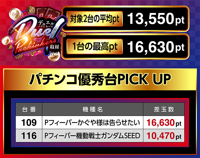 116番台の「Pフィーバー機動戦士ガンダムSEED」も10,000ptを上回った。