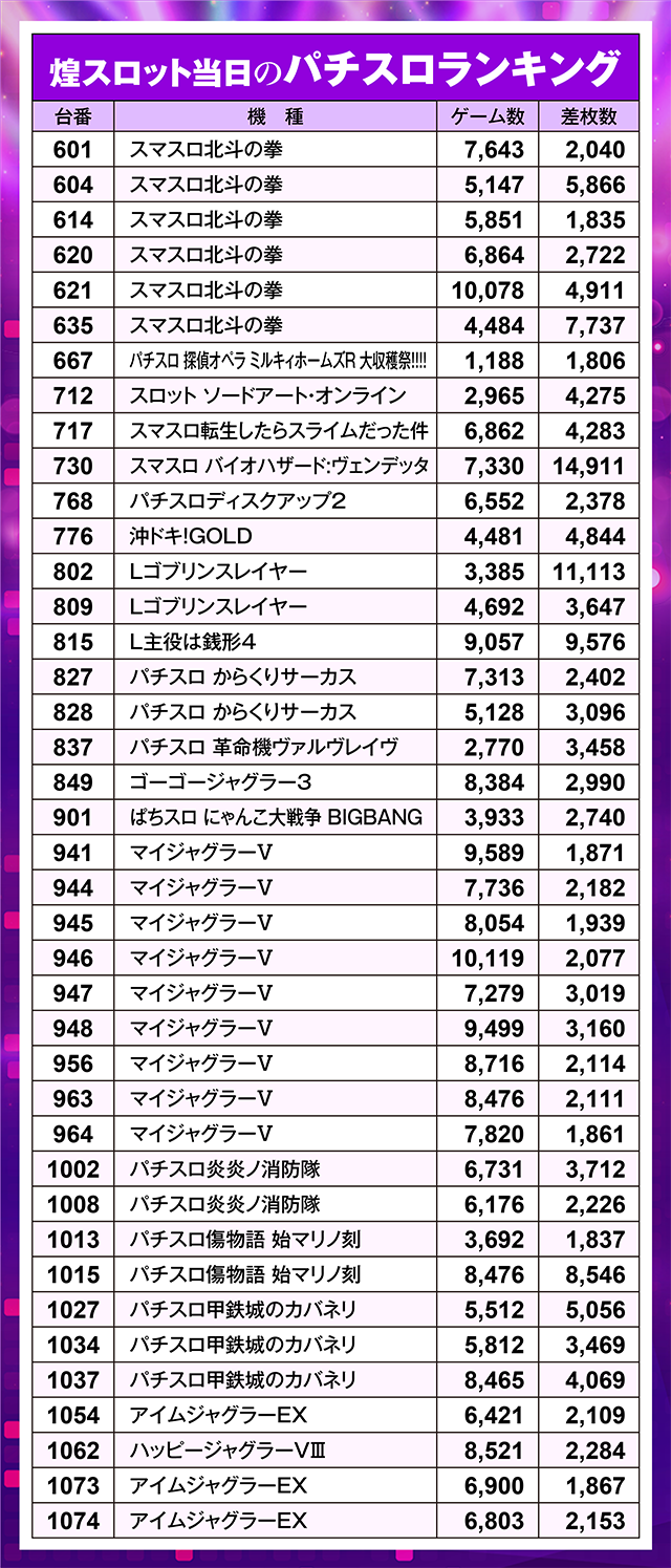 煌スロット当日のスロットランキング