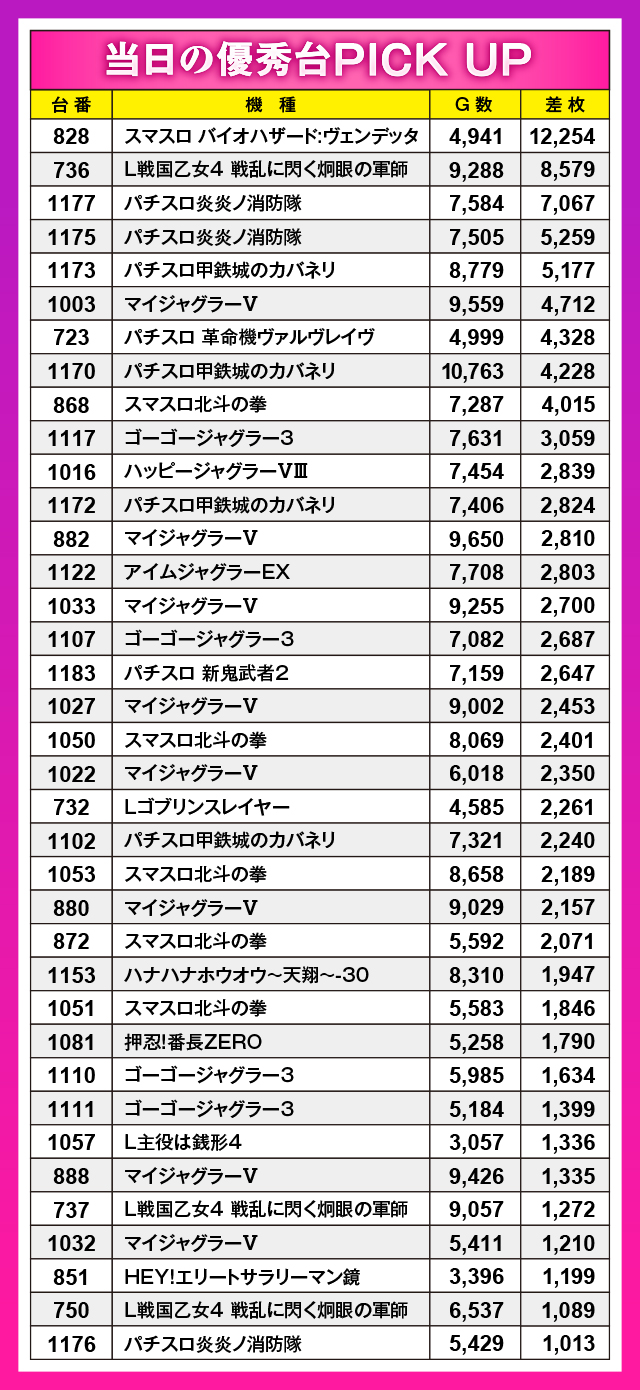 この日の首位記録は『スマスロ バイオハザード:ヴェンデッタ』の12,254枚という凄まじいものだった。上位の5台は全て5,000枚を上回るほどの強烈さを披露。また『ジャグラー』シリーズが14台もランクインしていたのが印象的だった。