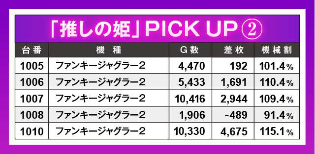 『ジャグラー』シリーズの中で最も勢いに乗っていたのが『ファンキージャグラー2』。2,000G未満の1台を除き、残り4台は安定してGOGOランプをペカらせまくり、しっかりプラス差枚を実現!