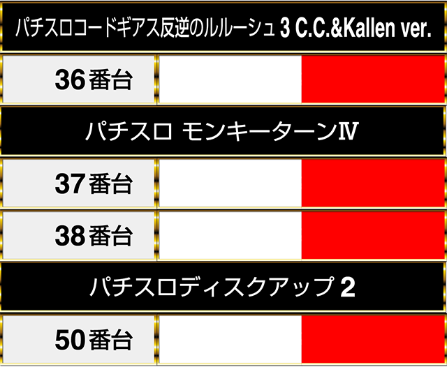36番台の『パチスロコードギアス反逆のルルーシュ3 C.C.&Kallen ver.』から50番台の『パチスロディスクアップ2』までも4台並びでプラスptを記録した。