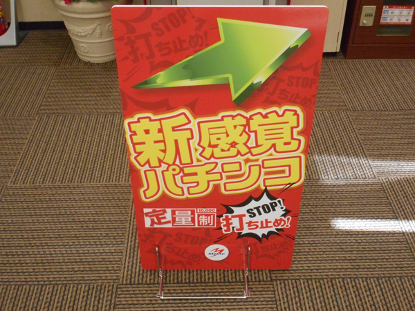 店内に入って真っ先に目についたのは12月から始まっている定量制パチンコという文字。遊技している台での持ち玉が規定の数になると打ち止めとなる形態で、「メッセ奥戸店」では一部の機種が1万発上限となっていた。