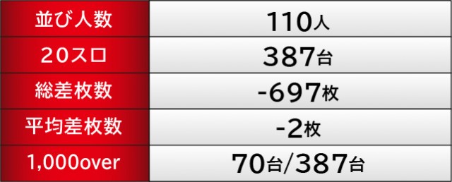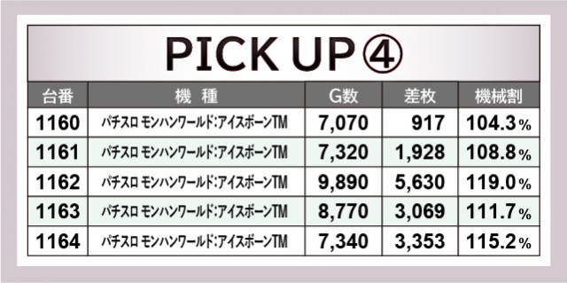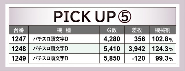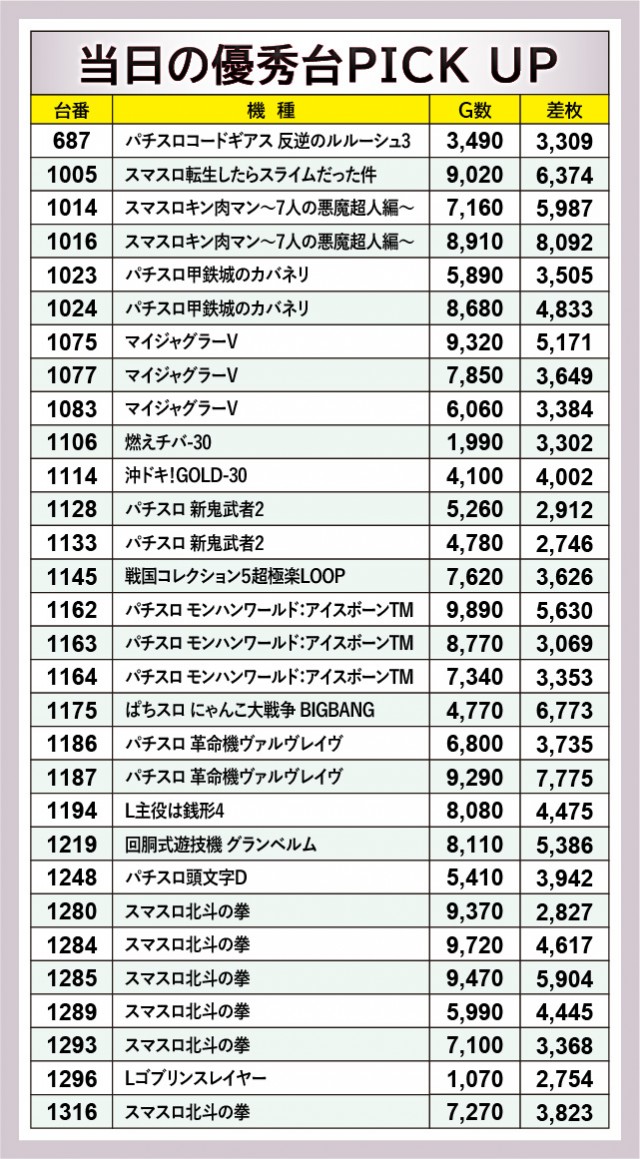 『パチスロ モンスターハンターワールド:アイスボーンTM』は大きな活気を披露するばかりか、凄まじい熱気を放っていたのが印象的だ。1162番台+5,630枚を筆頭に2台の3千枚OVER台が生まれるなど、同機種のポテンシャルを信じて遊技していたファンの姿が想像できる。また『パチスロ頭文字D』全3台も同様に奮起し、1248番台+3,942枚という記録を残した。