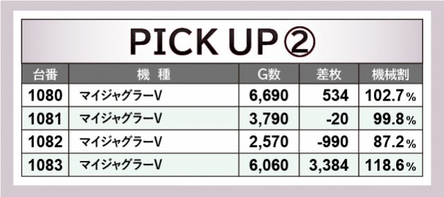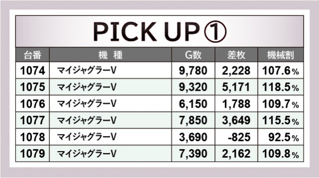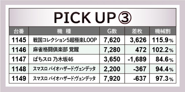 老若男女問わず愛される『マイジャグラーⅤ』は、1074~1083番台の10台で好況スポットが形成されていた。その中で1075番台+5,171枚という大きな記録が生まれており、遊技していたファンは恍惚の表情を浮かべていたことだろう。またバラエティー機種が含まれた1145~1149番台についても、『戦国コレクション5超極楽LOOP』1145番台+3,626枚という数字を確認でき、活気あふれる様子を披露していた。