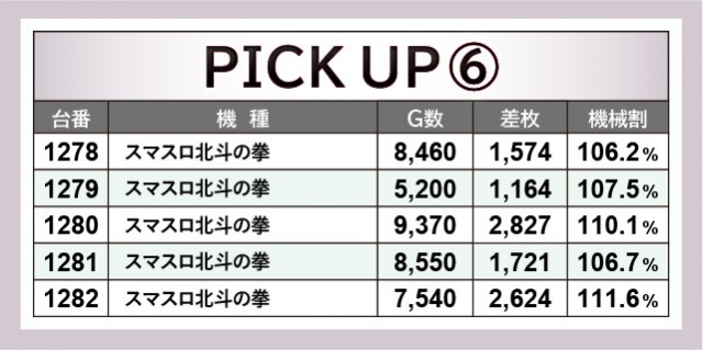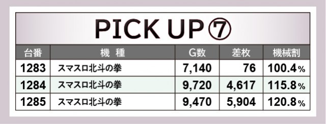 そして全国的な人気を誇る『スマスロ北斗の拳』は、当然のように活躍していた。1284番台+4,617枚・1285番台+5,904枚と大きな熱気を放っては、各台で9千回転台をマーク。同機種が多くのファンから信頼を寄せられており、同店もまた懇切丁寧に扱っていることが如実に窺える。