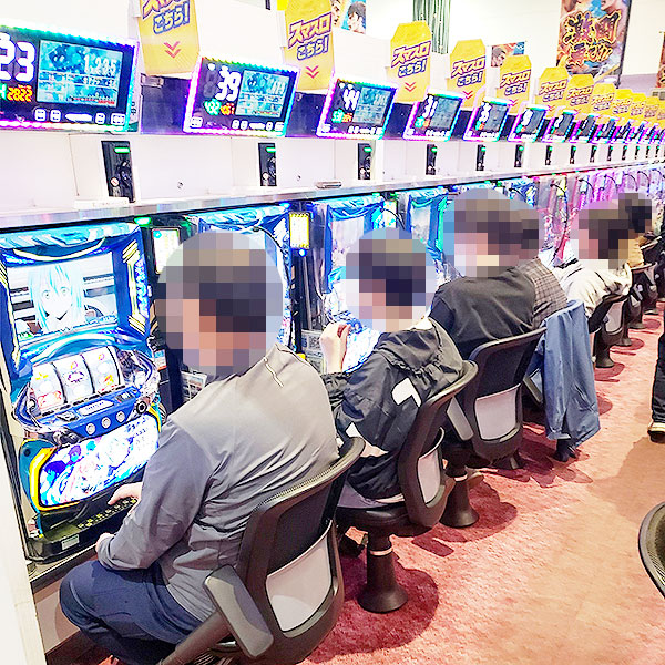午後の20円パチスロをチェックすると、「スマスロ北斗の拳」や「スマスロ転生したらスライムだった件」などのスマスロが盛況の様子。プレイヤーたちの満足気な表情が印象に残っている。