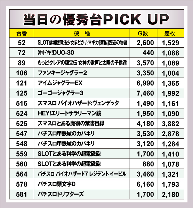 まずは差枚数+1,000枚以上だった優秀台16台を紹介していこう。全16台のうち+2,000枚オーバーは3台で、最優秀台は、525番台の「スマスロとある魔術の禁書目録」で差枚+3,882枚をマーク。全体的に不完全燃焼気味の結果ではあるが、しっかり回されている台はキッチリ結果が出ていたことが分かる。この結果から、全体的にもっと回されていれば、さらに素晴らしい結果になっていた可能性が高そうだ!