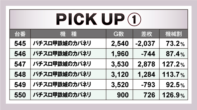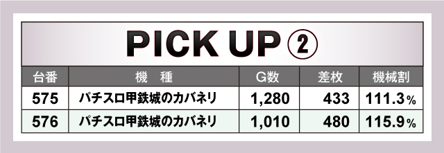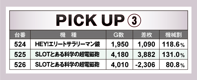 続いては、今回の取材のなかで注目してほしい3箇所をピックアップ。まず「パチスロ甲鉄城のカバネリ」は、先ほども触れた通り全体的に回転数不足ではあったものの、同機種は差枚+1,000枚オーバーが2台出現! また機種単位で見ても、全8台のうち5台がプラスで、平均差枚も+278枚で終了! 続いて最優秀台を含めた524番台〜526番台の3台並びは、2/3台がプラスの平均+889枚とこちらも好調な結果となった。その他の台にもチャンスが眠っていた可能性は高いので、次回実施の際は店内を見渡して注意深く立ち回ってみよう!