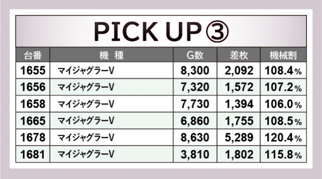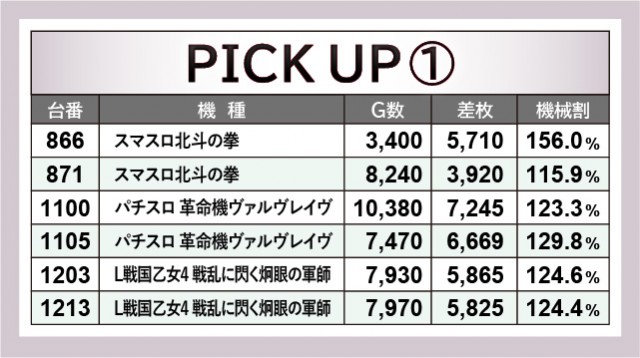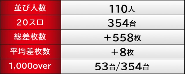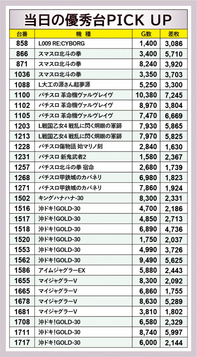 『パチスロ 革命機ヴァルヴレイヴ』1100番台+7,245枚や1105番台+6,669枚など、同機種から大きな熱量を確認できる。また『スマスロ北斗の拳』866番台+5,710枚や『L戦国乙女4 戦乱に閃く炯眼の軍師』1203番台+5,865枚も見られ、主にスマスロ勢が大きく盛り上がっていた様子だ。もちろん沖スロ・『ジャグラー』シリーズも奮闘しており、同店の高い実力を窺える内容になっている。