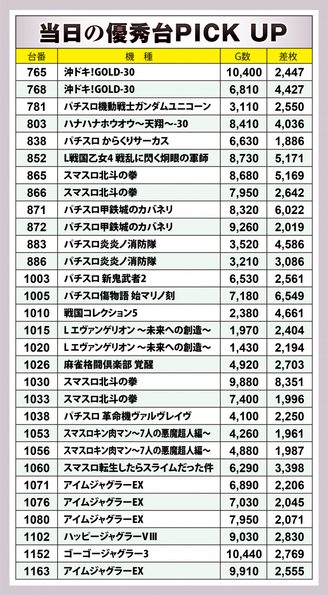 ここからは20スロ全193台の出玉データをチェックし、この日素晴らしい成績を果たした台をピックアップしていこう。