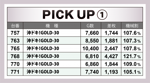 また『沖ドキ!GOLD-30』6台では+4千4百枚超が頂点となり、合わせて+1万4千枚手前に迫った。
