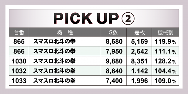 『スマスロ北斗の拳』5台は前回に続いて好記録が連発。+8千3百枚超と+5千2百枚弱が1台ずつで、その合計は+1万9千枚オーバーをマーク。