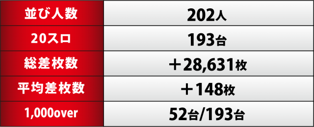 今回、20スロ193台のトータル差枚数は+28,631枚と、2回連続で数値が下がっているものの、快勝と言える数値で勝利を収めた。