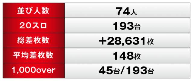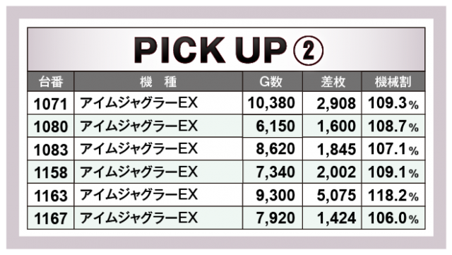 『沖ドキ!GOLD-30』では、3台の+4千枚超を筆頭に6台のトータル差枚数は+2万3千枚オーバーをマーク。また、『アイムジャグラーEX』の6台では、1163番台の+5千枚超を筆頭にトータル差枚数は+1万4千枚オーバーを記録した。