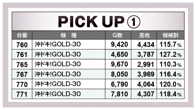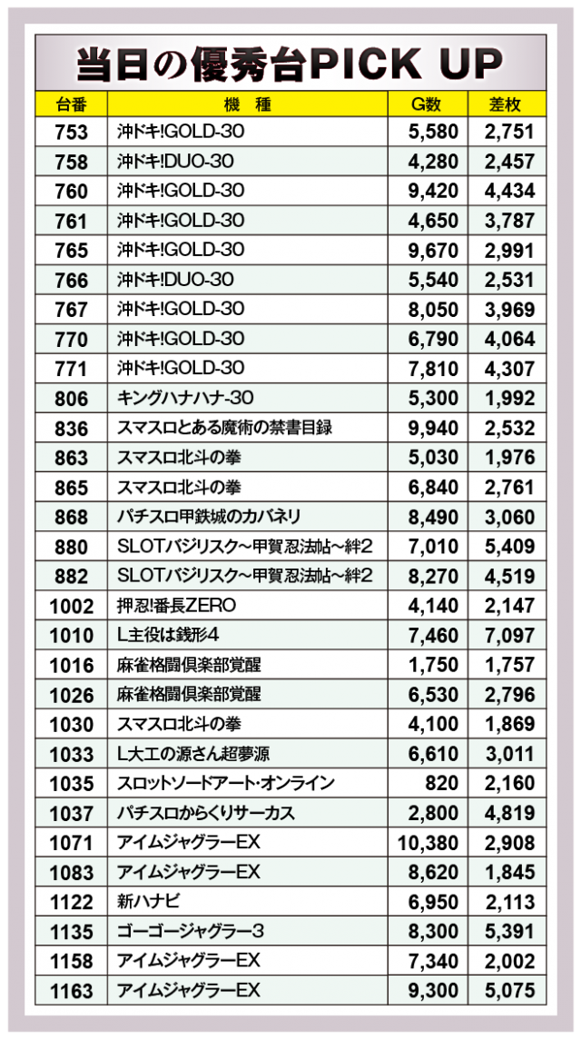 まずは優秀30台のPICK UPから。30台のうち25台が総差枚数+2,000枚以上を達成!+3,000枚オーバーは13台、+4,000枚オーバーは9台となった。とくに『沖ドキ!GOLD-30』がこの日多くのプラス記録を生んでおり、活気と熱気に満ちていた様子だ。