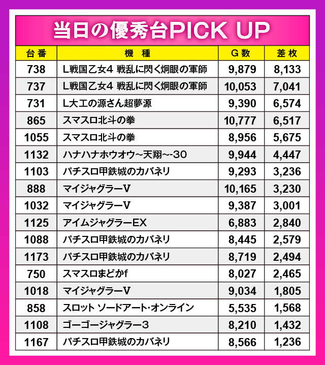 パチスロ総合ランキングで1・2フィニッシュを飾ったのは、伏兵『L戦国乙女4 戦乱に閃く炯眼の軍師』。ともに7,000枚を上回るハイパーレコードを披露してくれた。さらに3位には新台の『L大工の源さん超夢源』がランクインするなど、見どころの多い1日だった模様。また『ジャグラー』シリーズからは5台がランクイン!