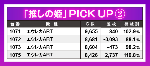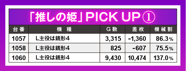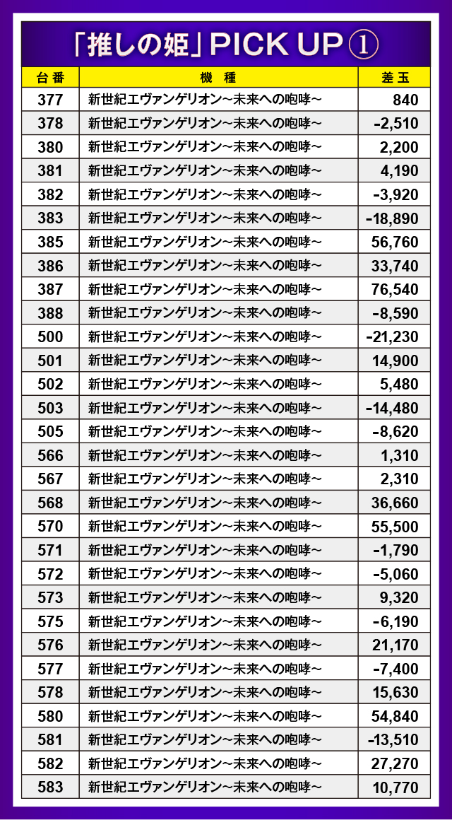 今回で3回目の「推しの姫」取材となったわけだが、そのパワーに衰えは一切感じられず、むしろさらにエネルギッシュな結果を量産していたように思う。特にパチの『新世紀エヴァンゲリオン~未来への咆哮~』は、他機種を寄せ付けないほどのモンスターレコードに溢れており、今後も狙うべき機種として覚えておいた方がいいだろう。また、スロ総合ランキング1・2位を奪取した『L戦国乙女4 戦乱に閃く炯眼の軍師』や、3台並びで好調だった3機種の健闘にも拍手を送りたい。