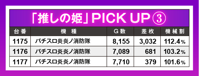 3台設置の『パチスロ炎炎ノ消防隊』も3台並びで好調をキープ。3台ともがしっかりとプラス域に浮上し、中でも1175番台は3,000枚を超える好結果を残してくれた。