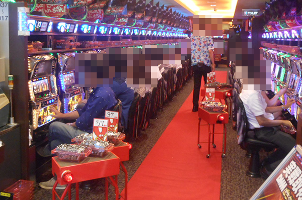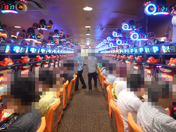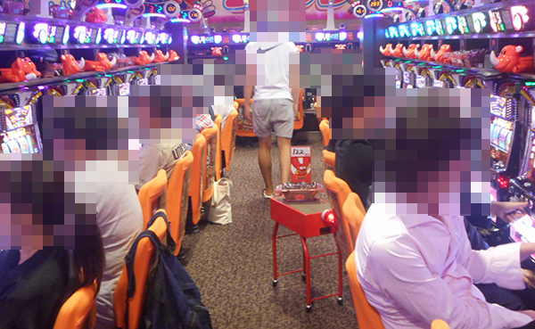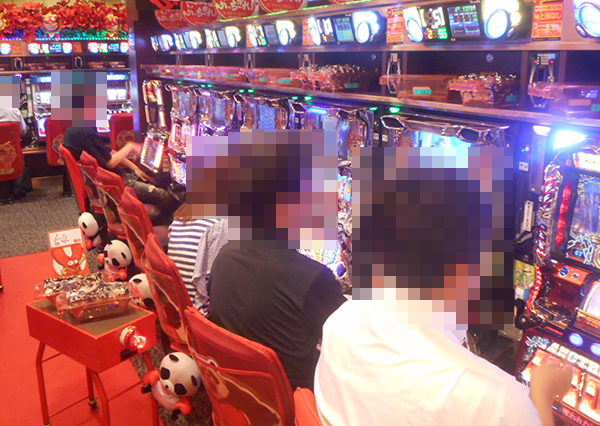 ホールに到着すると、すでに多数のライバルが遊技を楽しんでいる。よさげな台はたくさんあるものの、空き台はない。