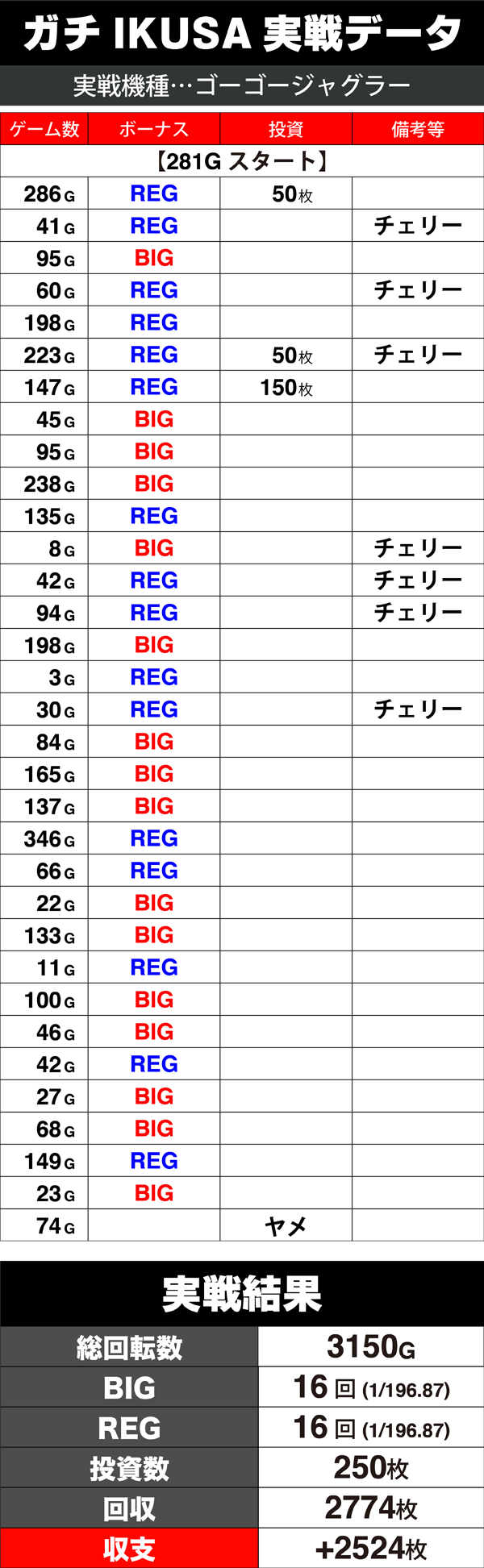 後半になるとBIGが追いつき、実戦終了時には約2500枚をゲット。ボーナス確率合算も設定6をオーバーといった結果に!