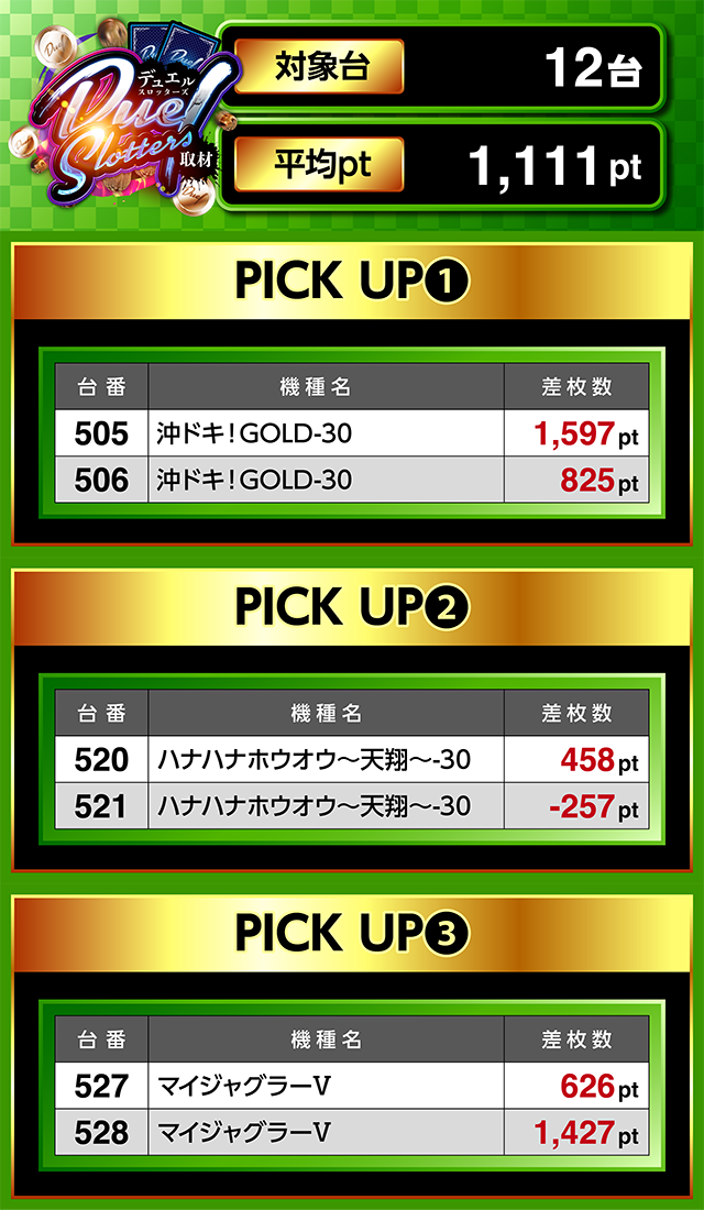 505番台と506番台の「沖ドキ!GOLD-30」にプラスが続き、505番台が1,500pt以上を記録。