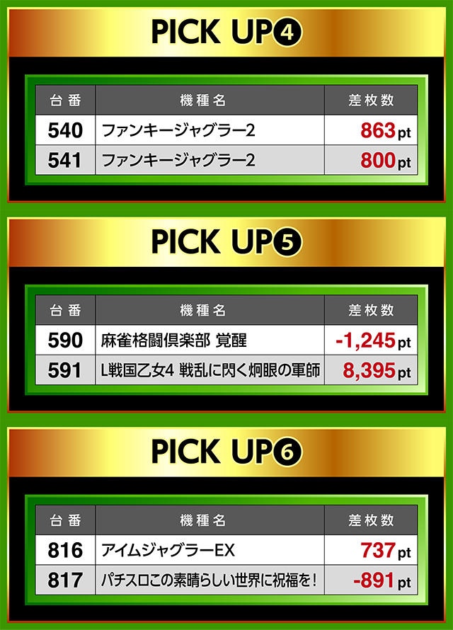 816番台と817番台も注目の並びで、816番台の「アイムジャグラーEX」がプラスで終えた。