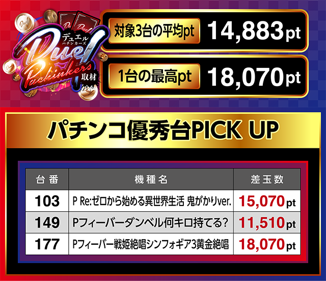 103番台の「P Re:ゼロから始める異世界生活 鬼がかりver.」と149番台の「Pフィーバーダンベル何キロ持てる?」も11,000ptを上回った。