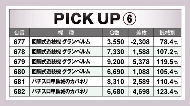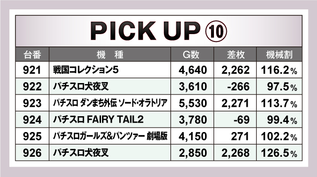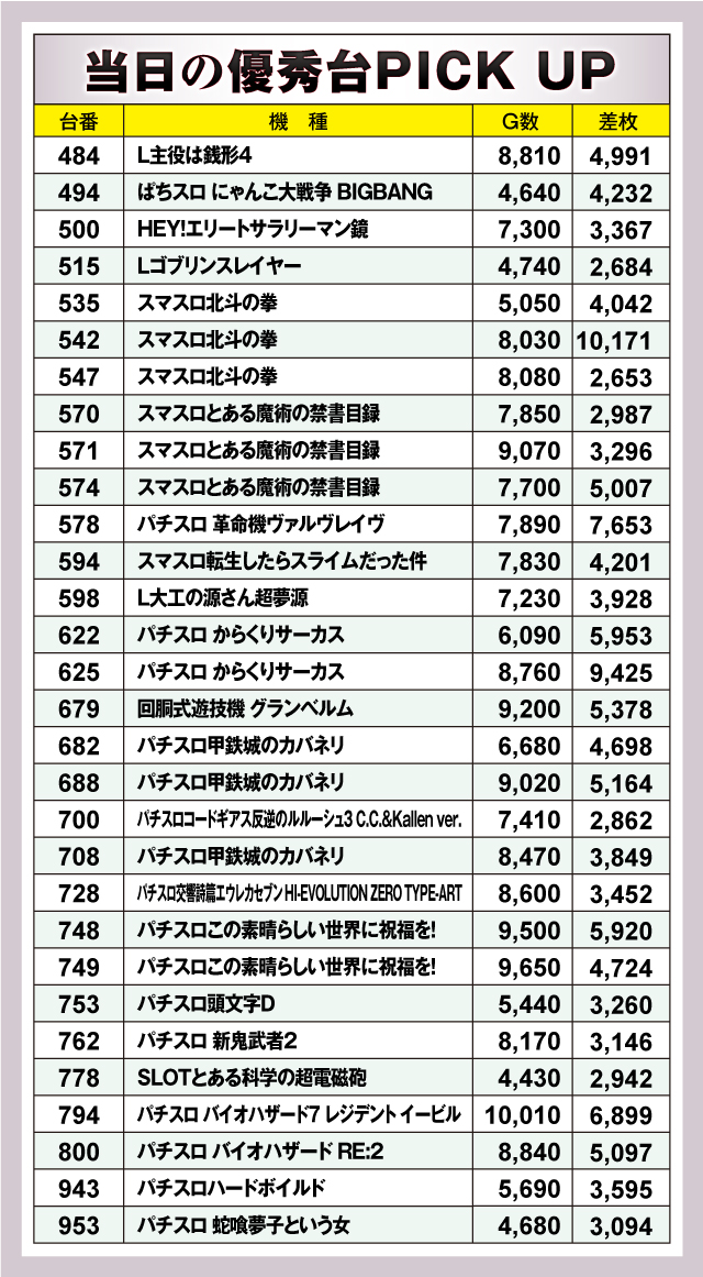 続いては、当日ならびで活躍していた10箇所を紹介。すべての並びが平均+1,000枚を超える好調ぶりで、そのうち平均+2,000枚オーバーの並びは6箇所出現! なかでも621番台〜626番台の「パチスロ からくりサーカス」は、5/6台がプラスで平均+3,395枚と圧倒的! 荒い機種ながらもしっかりと結果を残していた!