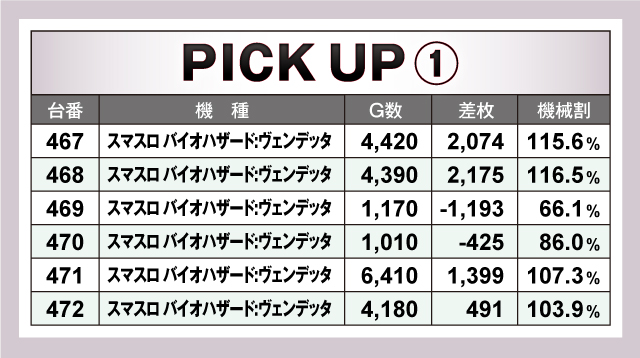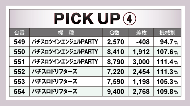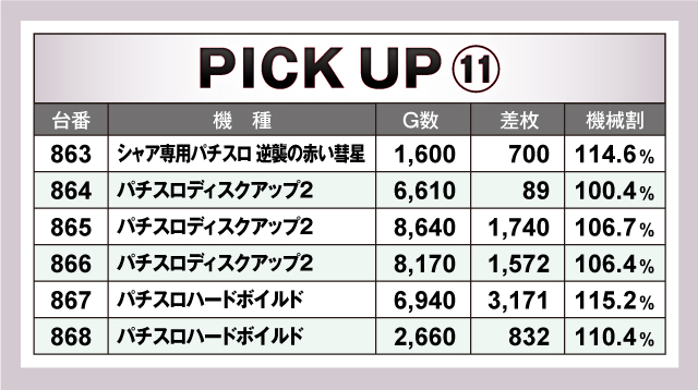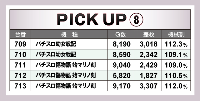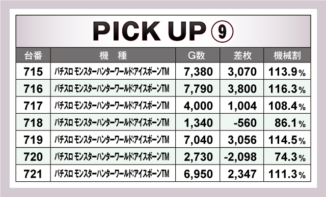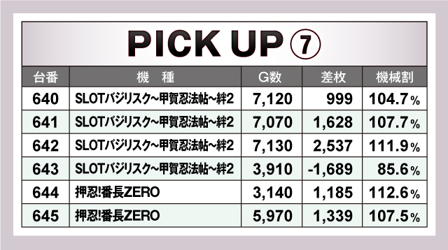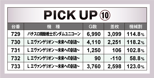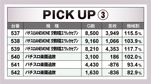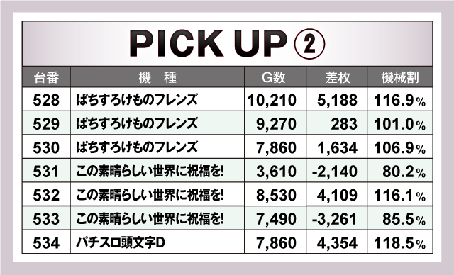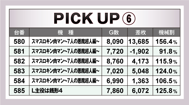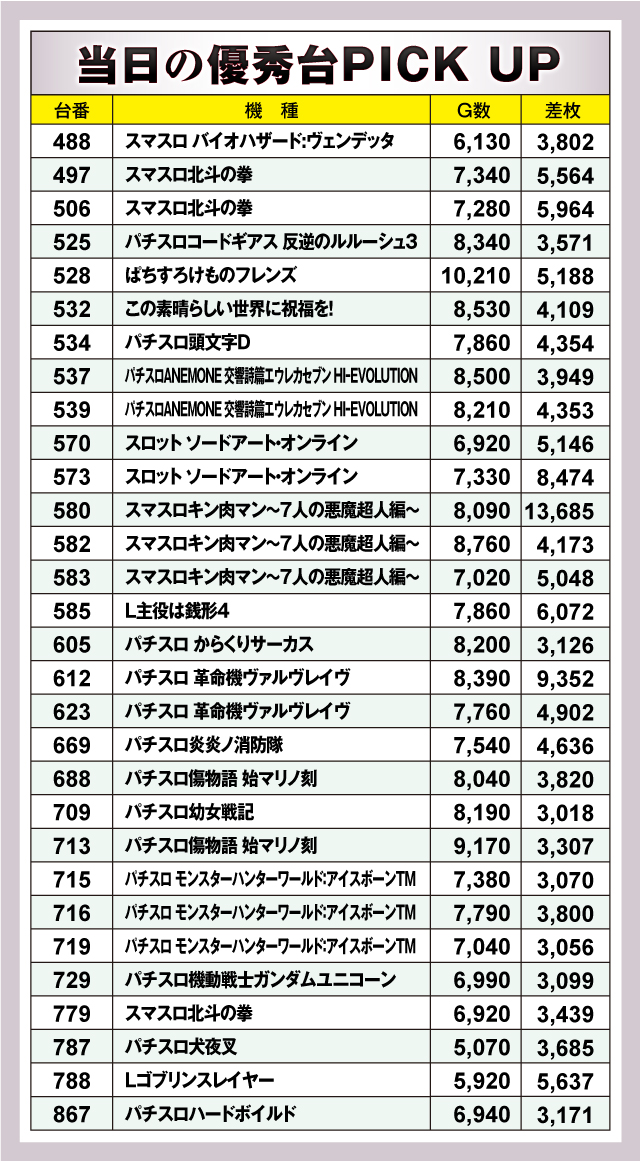 まずは優秀30台ピックアップの紹介から。ピックアップ30台全てが+3,000枚を超えており、+5,000枚オーバーは10/30台出現! そしてもっとも優秀だった台は、580番台の「スマスロキン肉マン~7人の悪魔超人編~」で、差枚+13,685枚と素晴らしい結果をマーク! 30台全体を見渡すと、スマスロを中心に10台以上の多台数設置機種が目立っていたが、その他「パチスロANEMONE 交響詩篇エウレカセブン HIーEVOLUTION」「この素晴らしい世界に祝福を!」「ぱちすろけものフレンズ」などの3台設置機種も多数ランクイン。幅広い機種に楽しめる環境が用意されていたようだ!