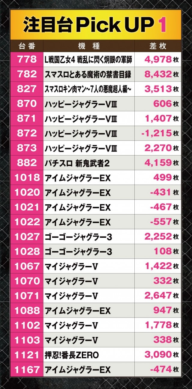 店内状況をチェックすると、ジャグラーシリーズを中心に好調台が誕生していた。しかしこの日一番目を引いたのはスマスロだ!『スマスロとある魔術の禁書目録』の+8,432枚や『L戦国乙女4 戦乱に閃く炯眼の軍師』は+4,978枚など、華麗なパフォーマンスを披露している。