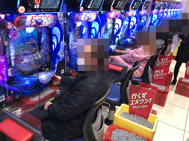 持ち玉で遊技をおこなっている姿も多く、取材時には最大で大箱5箱以上の持ち玉を確認した。